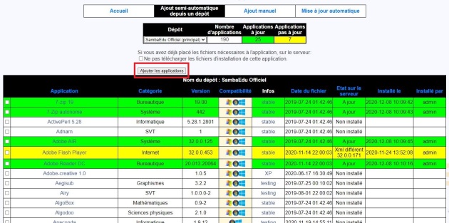 Les applications "vertes" sont celles qui sont installées et à jour sur notre serveur