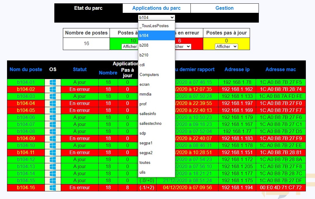 État du parcSur la page d'accueil, on va pouvoir sélectionner un parc, et afficher l'état des postes de ce parc.Rouge : en erreurVert : à jour