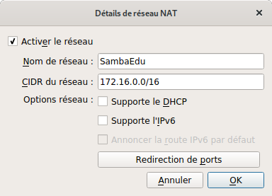 On pourra créer un réseau nommé SambaEdu avec les caractéristiques suivantes :